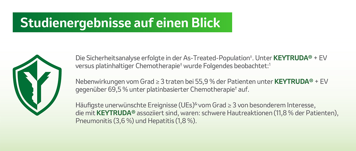 In der zulassungsrelevanten Studie KEYNOTE-A39 wurde die Sicherheit in der As-treated-Population◊ nach einer medianen Behandlungsdauer von 9,4 Monaten (Spanne: 0,3–31,9 Monate) unter KEYTRUDA® + EV über median 12 Zyklen (Spanne: 1–46) und 4,1 Monate (Spanne: 0,0–0,7) über median 6 Zyklen (Spanne: 1–6) unter platinhaltiger Chemotherapie† untersucht. Die mediane Behandlungsdauer mit KEYTRUDA® betrug dabei 8,5 Monate (Spanne: 0,3–28,5) über median 11 Zyklen (Spanne: 1–35).1